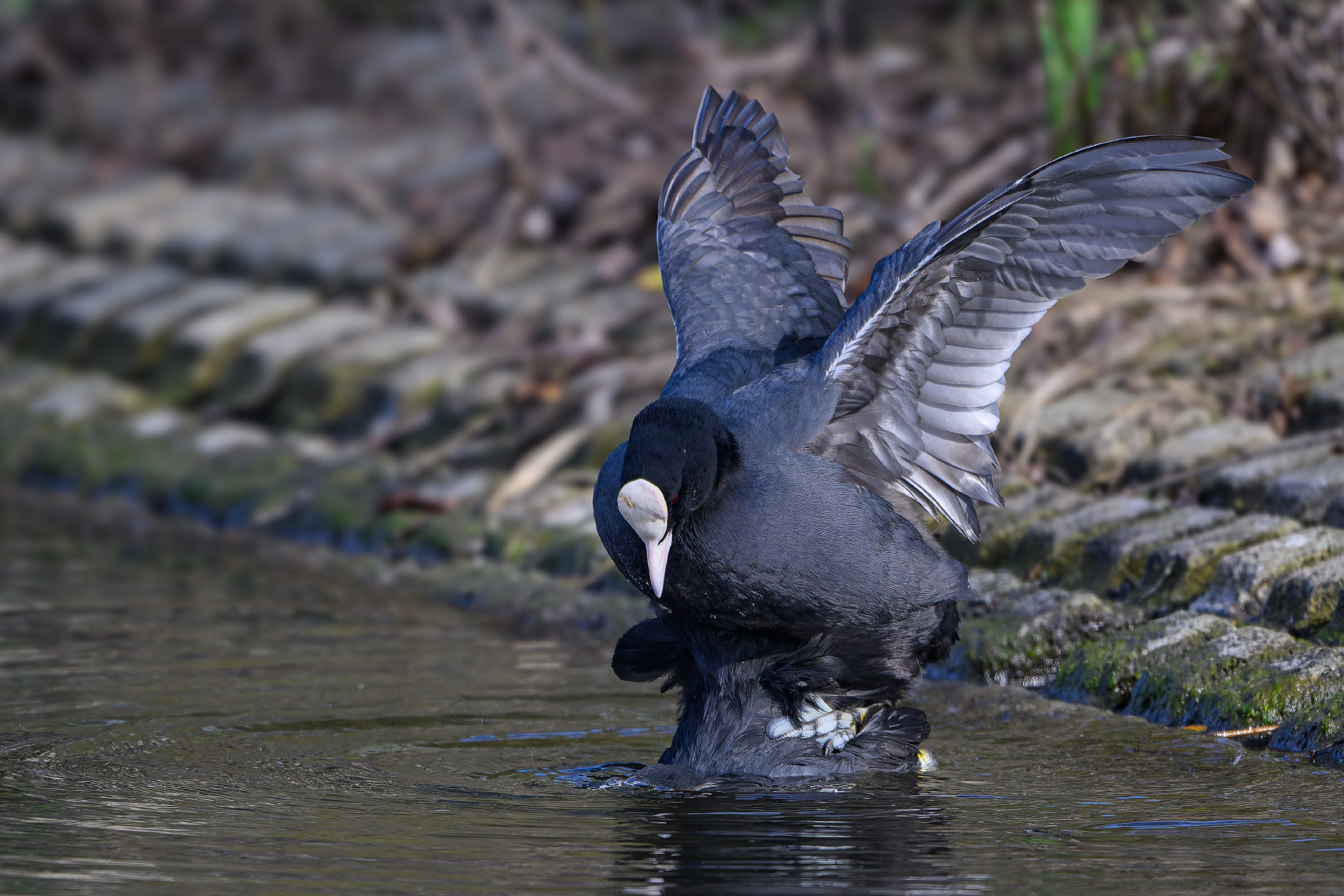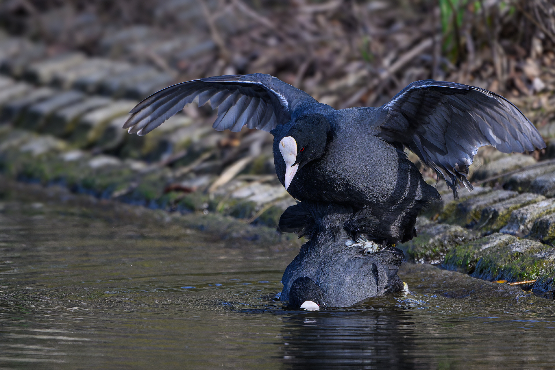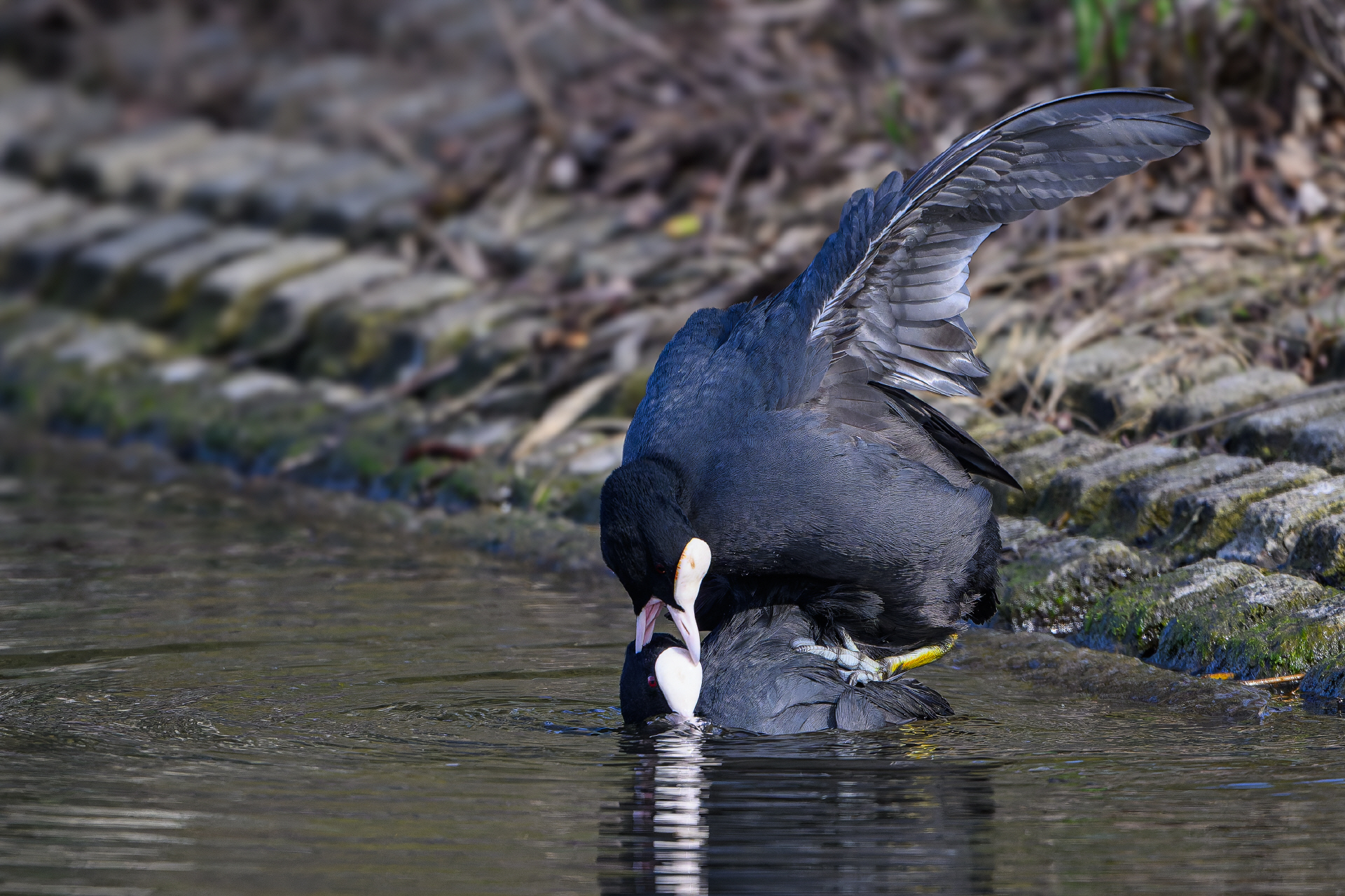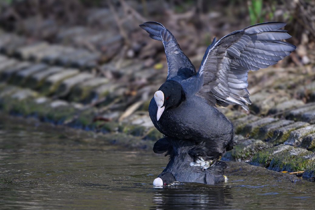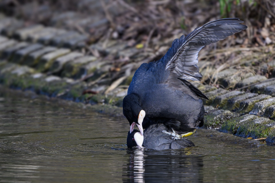 Die Balzzeit der Blässhühner ist zur Zeit in vollem Gange und die Vögel verteidigen vehement und mit ganzem Körpereinsatz ihr Revier.